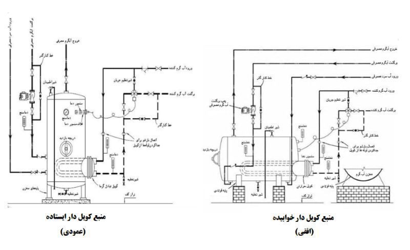 3. منبع کویل دار باید مجهز به شیر اطمینان و شیر تخلیه باشد، که خروجی های آن در منابع تولیدی،در نظر گرفته شده است.