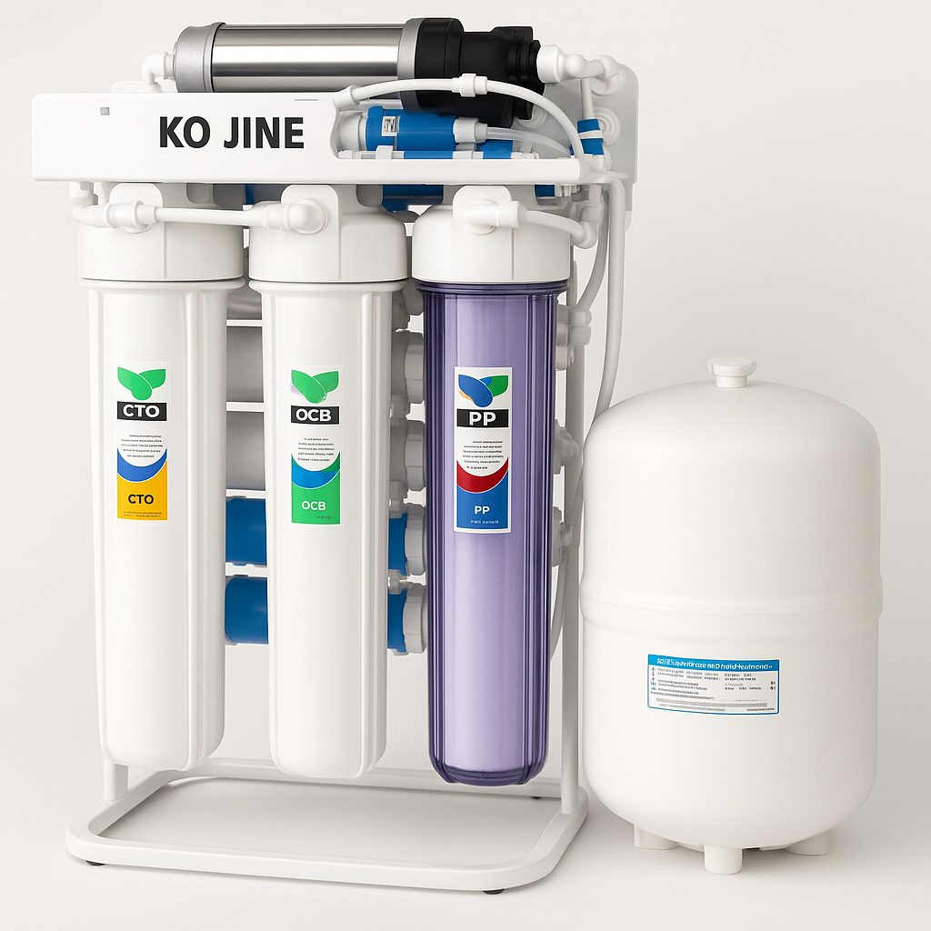 دستگاه تصفیه آب نیمه صنعتی برند KOJIN تایوان، مجهز به پمپ دیافراگمی دوگانه با دبی 4 لیتر/دقیقه است که توان تولید 400 گالن یا حدود 1,600 لیتر در شبانه روز را فراهم می سازد. سیستم شامل چهار ممبران 100 گالنی Filmtec با برند تایوانی وارداتی، فیلترهای پیش تصفیه (فیلتراسیون شنی، کربنی و الیافی)، شیر کنترل پساب و گیج فشار روغنی می باشد، همگی براساس استانداردهای صنعتی و برای افزایش طول عمر و کاهش تعمیرات طراحی شده اند.